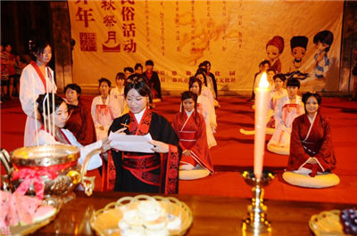 在月下,將月亮神像放在月亮的那個方向,紅燭高燃,全家人依次拜祭月亮,然后由當(dāng)家主婦切開團圓月餅。切的人預(yù)先算好全家共有多少人,在家的,在外地的,都要算在一起,不能切多也不能切少,大小要一樣。