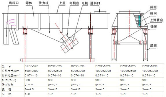 當(dāng)縱向安裝在篩體上的兩臺(tái)振動(dòng)電機(jī)兩端的偏心塊便產(chǎn)生額定激振力,其產(chǎn)生在橫向的激振力相互抵銷(xiāo),其縱向的激振力通過(guò)傳振體傳遞到整個(gè)篩面上,從而使篩面上的物料受其激振力而在篩網(wǎng)面上向出料口方向跳躍運(yùn)動(dòng)。小于篩孔的物料通過(guò)篩孔落到下層,大于篩孔的物料經(jīng)連續(xù)跳躍后,經(jīng)出料口流出,由于篩分過(guò)程合理,可將物料經(jīng)振動(dòng)篩分級(jí)后,取得幾種不同顆粒的物料,完成物料的分級(jí)。